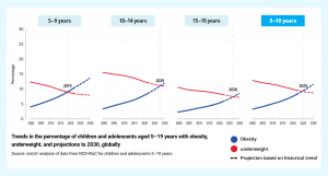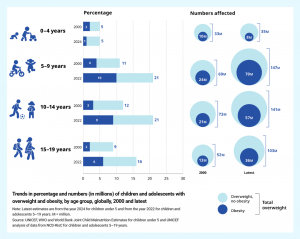 З 2000 року чисельність дітей шкільного віку та підлітків із надмірною вагою зросла більш ніж удвічі — з 194 мільйонів до 391 мільйона. Загалом у світі понад 390 мільйонів дітей мають надмірну вагу або ожиріння. Якщо раніше ця проблема вважалася типовою для країн із високим рівнем доходу, то нині вона дедалі більше охоплює держави з низьким та середнім рівнем доходу. Найбільш стрімке зростання спостерігається саме у цих країнах, на які зараз припадає понад 80% усіх дітей та підлітків із надмірною вагою. Ще більш тривожним є факт, що ожиріння — найтяжча форма надмірної ваги — становить дедалі більшу частку серед усіх випадків.
