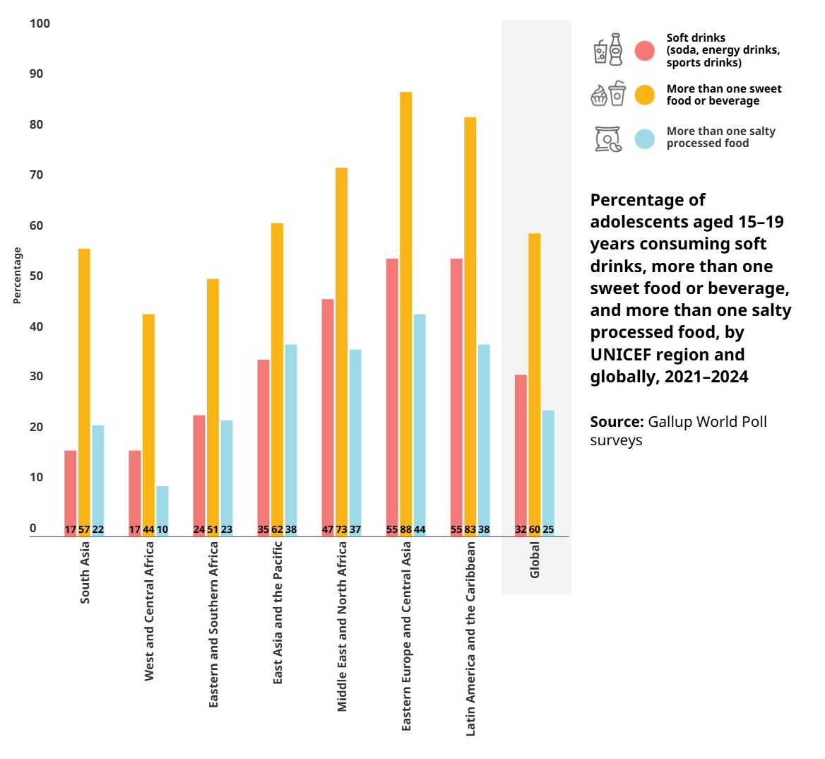 Основи здорового харчування формуються ще в ранньому дитинстві. Проте значна частина маленьких дітей віком від 6 до 23 місяців не отримує навіть найпростіших поживних продуктів — овочів і фруктів, яєць чи м’ясних страв. Натомість багато хто з них уже в цьому віці регулярно споживає нездорову їжу та напої. Ці харчові звички зберігаються й у підлітковому віці, перетворюючись на стійку модель харчування. Ультраоброблені продукти, солодкі та солоні закуски, а також газовані напої поступово стають основою раціону підлітків. Масштаби проблеми вражають: 60% підлітків у світі вживали більше одного солодкого продукту чи напою протягом попереднього дня; 32% споживали безалкогольні газовані напої; 25% їли більше одного солоного обробленого продукту за день. Така статистика демонструє, наскільки глибоко нездорова їжа проникла в щоденний раціон дітей і підлітків та як рано формується залежність від неї.