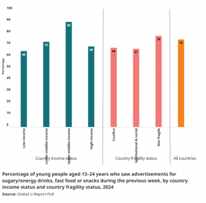 Одним із головних чинників поширення проблеми є агресивне просування нездорових продуктів. Їжа з високим вмістом цукру, солі та шкідливих жирів активно рекламується й стає доступною навіть наймолодшим споживачам. За даними глобального опитування U-Report, проведеного через SMS та соціальні мережі, троє з чотирьох молодих людей бачили рекламу нездорової їжі протягом попереднього тижня. Найбільший вплив маркетингу фіксується у країнах із доходом вище середнього, проте подібна практика є поширеною всюди — навіть у кризових та конфліктних регіонах. Харчова індустрія цілеспрямовано формує харчові звички дітей, використовуючи: рекламу на телебаченні й у цифровому просторі, ігрові додатки, соціальні мережі з прихованими формами впливу. Сучасні маркетингові стратегії стають цифровими, персоналізованими й майже невидимими для батьків та регуляторів. Це дає виробникам ультраоброблених продуктів безпрецедентні можливості впливати на щоденний вибір дітей ще до того, як вони починають усвідомлювати наслідки для здоров’я.